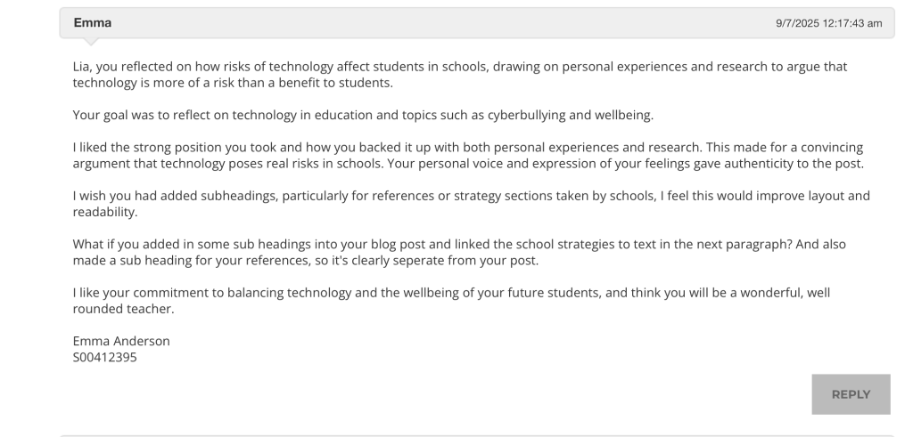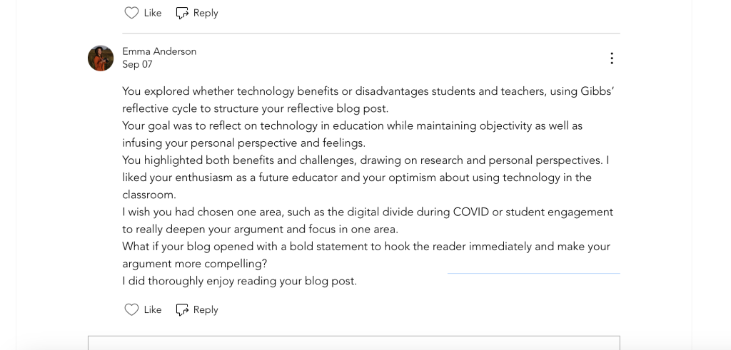 Comments Below are screenshots of feedback I gave to 2 classmates on their reflective blogs Visited 18 times, 1 visit(s) today